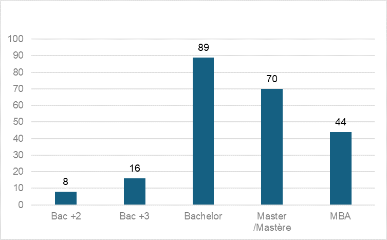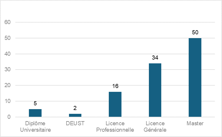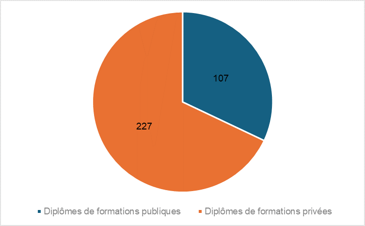 Cette répartition est toutefois à nuancer car elle n’est pas révélatrice des effectifs associés à ces types de formations. En effet, ne sont comptabilisés pour les universités publiques que les formations diplômantes dont certaines, notamment le niveau licence, disposent d’effectifs importants. A l’inverse, certaines formations offertes par des écoles privées sont découpées en plusieurs années au sein d’un même niveau et sont composées d’effectifs bien moins importants.