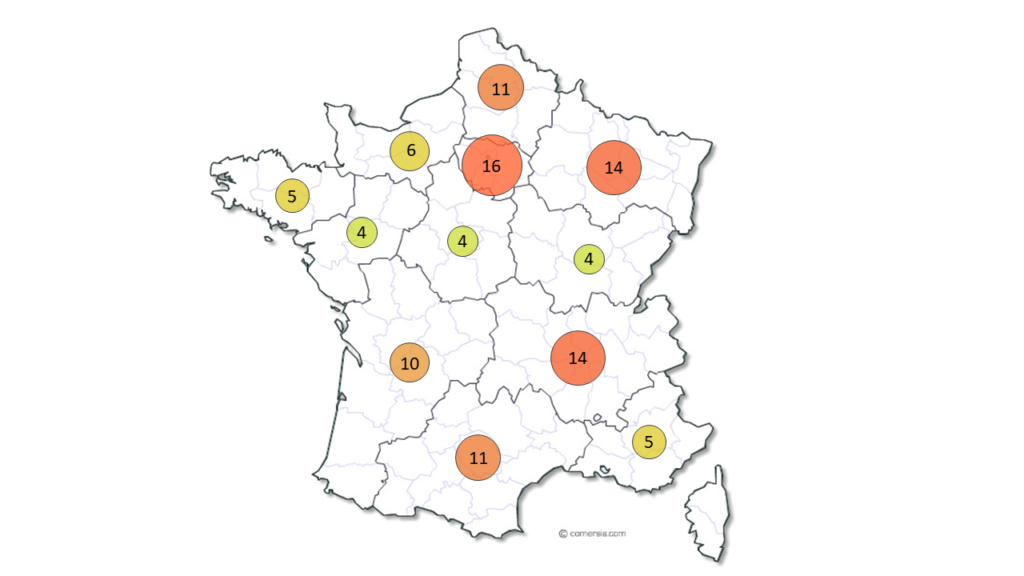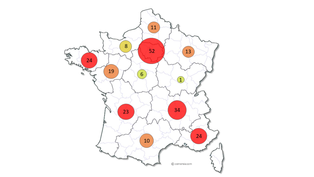La répartition géographique montre une surreprésentation des formations privées sur les formations publiques notamment en région Ile de France (52 vs 16), en Bretagne (24 vs 5), en Auvergne Rhône Alpes (34 vs 14), en PACA (24 vs 5) et en Nouvelle Aquitaine (23 vs 10). Les autres régions font état d’une offre plus équilibrée entre formations publiques et privées.